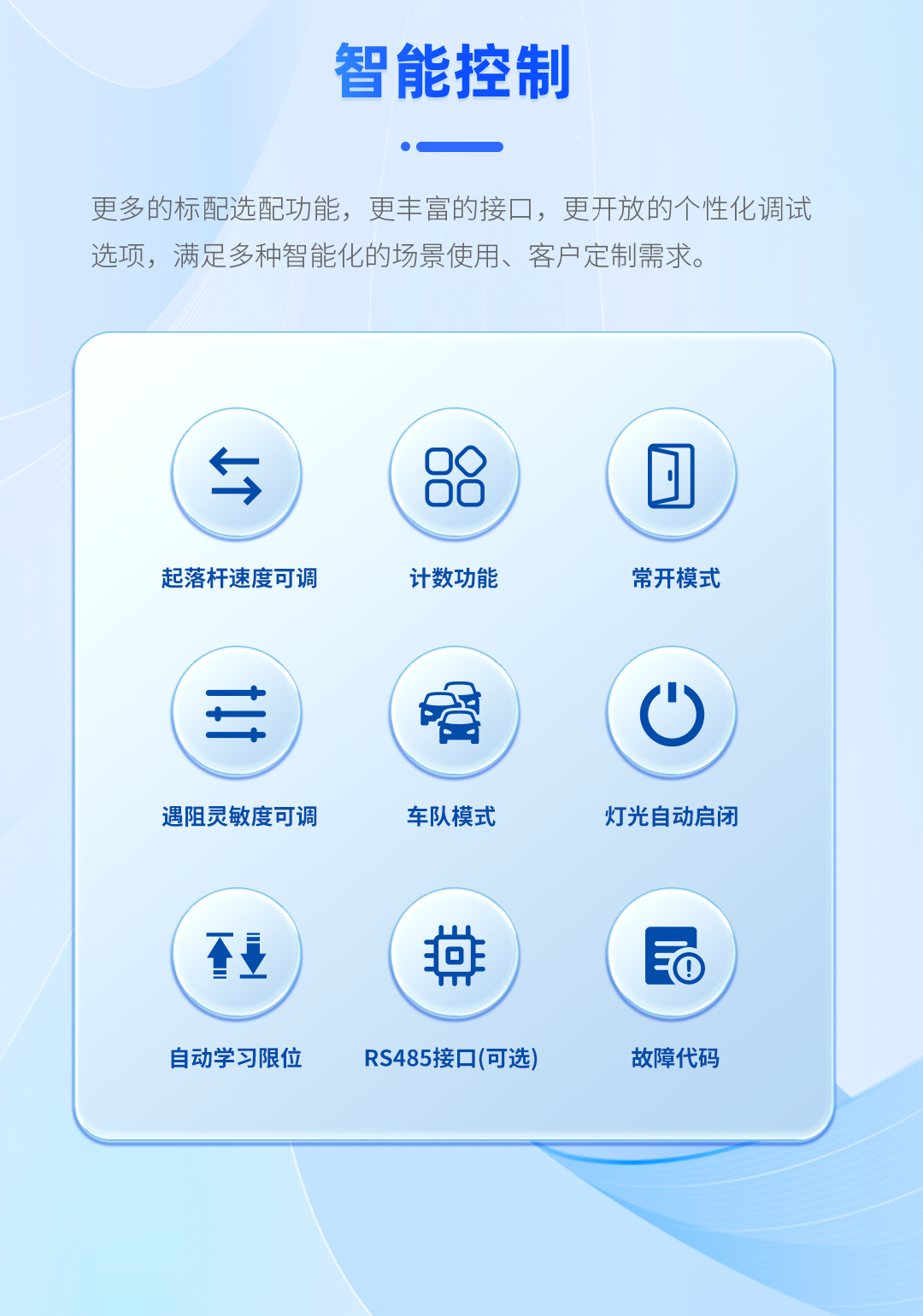 具備遇阻返回、24V安全電壓、電機(jī)抗熱保、抗電涌保護(hù)智能自檢等多重保護(hù)功能,極大提高輕型廣告道閘使用安全性和可靠性。
